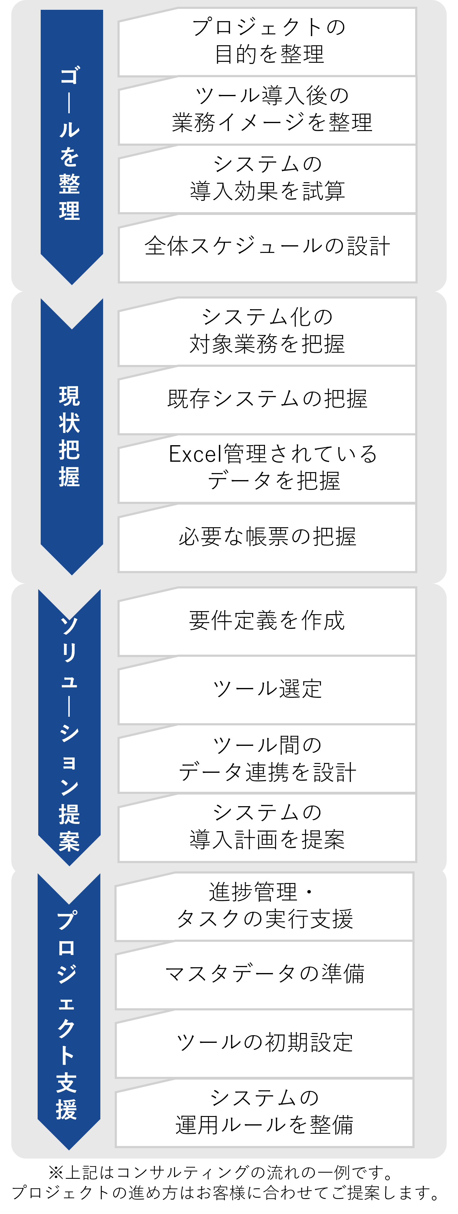プロジェクトとして何を目指すのか、業務課題がどのように解決できるのか明確にしてからご支援がスタートします。ただツール導入して終わりではないのが、ABKSSのITコンサルティングの特徴です。