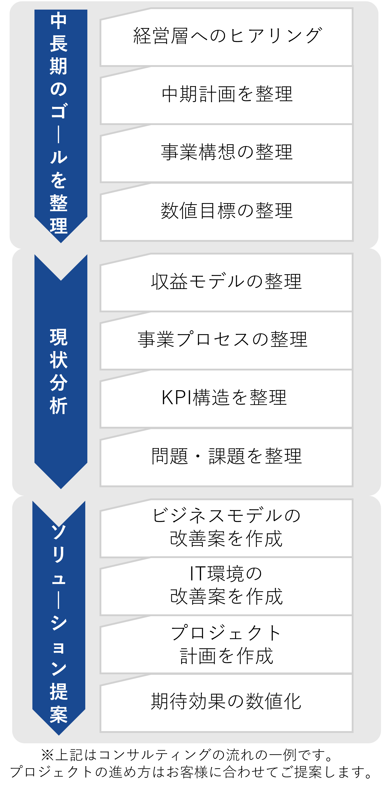 中小企業に特化し、売上成長・コスト改善を支援するコンサルティングサービスです。経営課題や事業構想を整理し、「いま何をすべきか?」を明確にします。